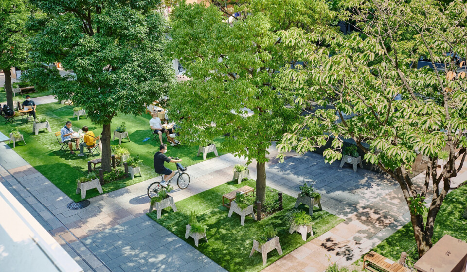 かねてから課題となっていた区道の放置駐輪対策をきっかけに、将来的に近隣住民やオフィスワーカーが滞留できるよう、みどりを起点とした環境整備を構想しています。2020年8月に放置駐輪と環境美化を目的に期間限定で芝生・プランター等を設置する社会実験を行いました。